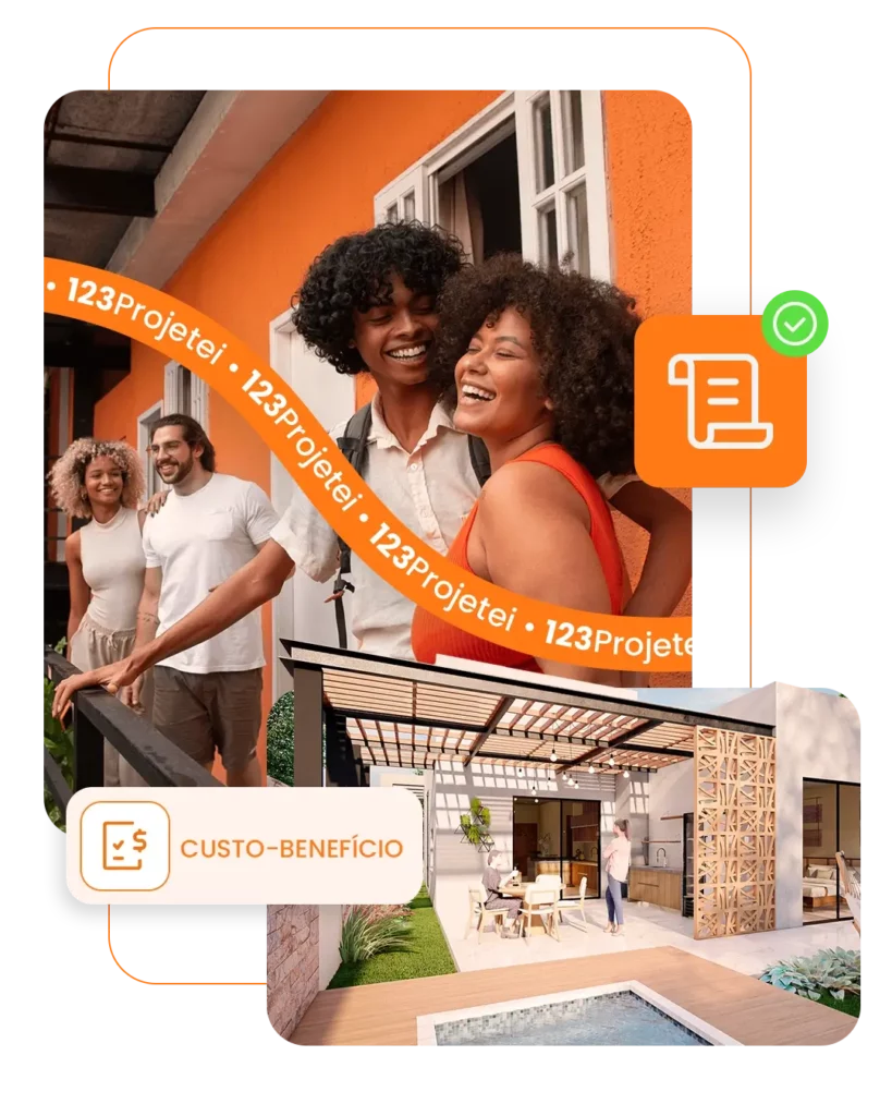 Nossos projetos são desenvolvidos dentro da metodologia 123Projetei que leva em conta orientação solar, características dos moradores da casa, custo-benefício e qualidade na construção. Nas entregas, você recebe planta baixa, planta de situação e localização e auxílio para obtenção do alvará de construção.
